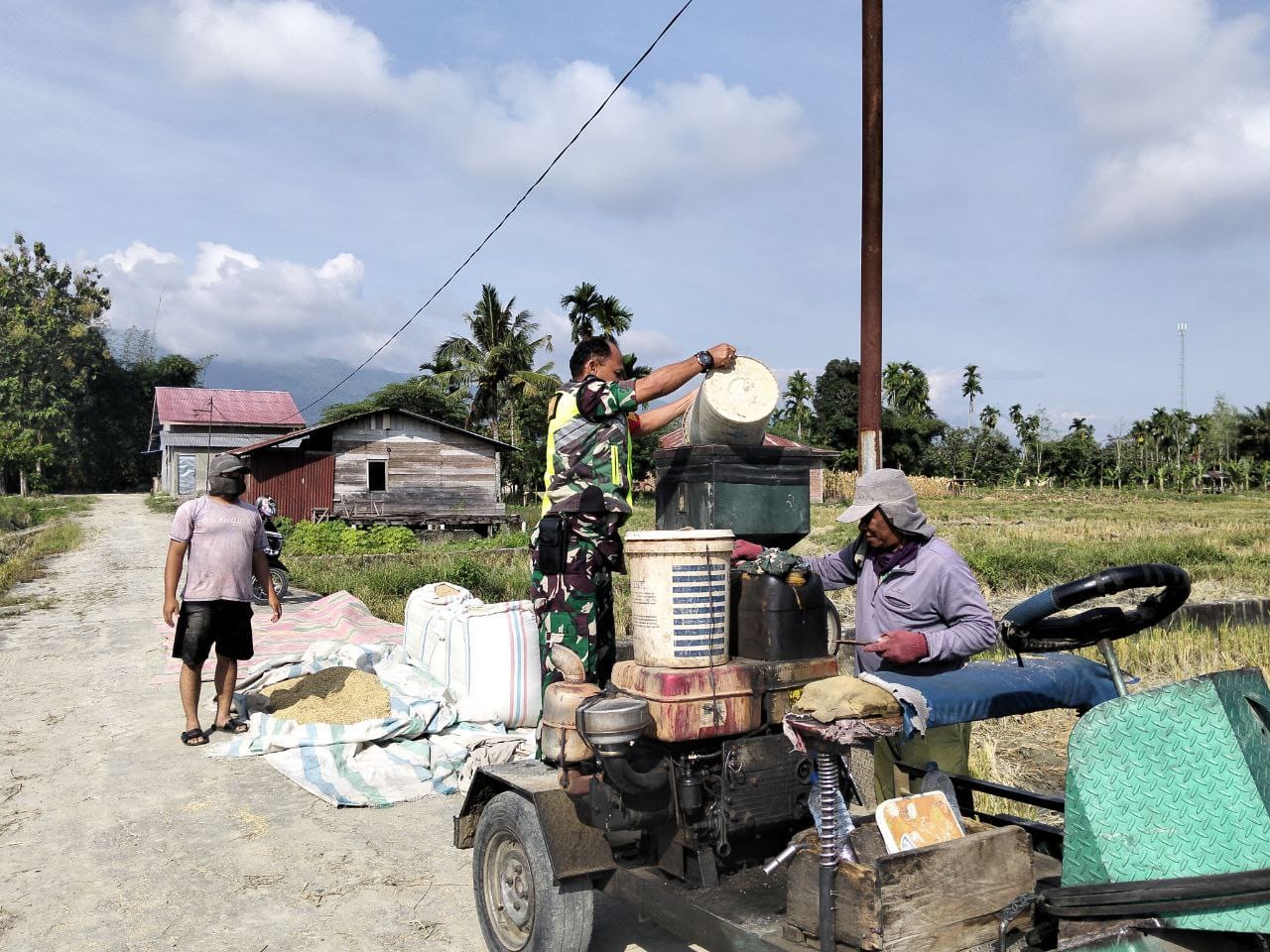 Babinsa Koramil 0108-04/Babussalam Bantu Petani Giling Padi di Desa Binaan