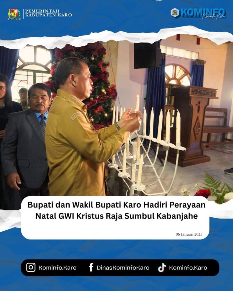 Tanah Karo – 06/01/2025, AgaraNews.com // Bupati Karo, Brigjen Pol (Purn) Dr. dr. Antonius Ginting, Sp.OG., M.Kes., bersama Wakil Bupati Karo, Komando Tarigan, SP., menghadiri Perayaan Natal Gereja Bethel Indonesia (GWI) Kristus Raja Sumbul Kabanjahe, yang dilaksanakan pada Selasa (6/1). Perayaan Natal ini mengangkat tema “Jemaat yang Berakar, Bertumbuh dalam Yesus” dengan ayat Alkitab Kolose 2:6–7 yang dibawakan oleh Pdt. Yosman B Tarigan.