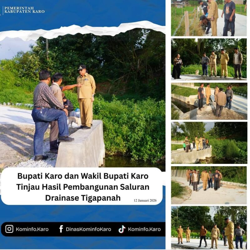 Tanah Karo, AgaraNews.com // Bupati Karo Brigjen Pol (Purn) Dr. dr. Antonius Ginting, Sp.OG., M.Kes, bersama Wakil Bupati Karo, Komando Tarigan, S.P., meninjau hasil pembangunan saluran drainase menuju pembuangan akhir di Kecamatan Tigapanah, Senin (12/01/2026).