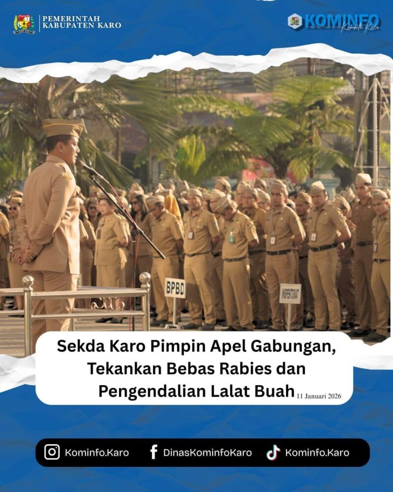 Tanah Karo, AgaraNews.com //Bupati Karo, Brigjen Pol (Purn) Dr. dr. Antonius Ginting, Sp.OG., M.Kes., yang diwakilkan oleh Sekretaris Daerah Kab. Karo, Gelora Kurnia Putra Ginting, S.STP., MM., bertindak sebagai pembina apel gabungan di lingkungan Pemerintah Kabupaten Karo. Dalam kesempatan tersebut, Sekda Kab. Karo menekankan sejumlah hal strategis terkait sektor pertanian, serta peningkatan kinerja pemerintahan tahun 2026. Dilaksanakan di Halaman Kantor Bupati Karo, pada senin (12/1).
