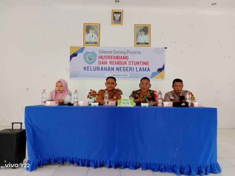 Labuhanbatu – AgaraNews.com// Babinsa Koramil 09/NL Kodim 0209/Labuhanbatu, Peltu Muhammad Hakim, menghadiri kegiatan Musyawarah Perencanaan Pembangunan (Musrenbang) dan Rembuk Stunting Tahun 2026 yang dilaksanakan di Balai Kelurahan Negeri Lama, Kecamatan Bilah Hilir, Kabupaten Labuhanbatu, Senin (12/01/2026).Kegiatan tersebut bertujuan untuk menyerap aspirasi masyarakat dalam perencanaan pembangunan kelurahan sekaligus membahas langkah percepatan penurunan angka stunting. Hadir dalam kegiatan ini Sekcam Bilah Hilir Siti Zianab, SST., MKM, Lurah Negeri Lama Syarifuddin Nst, SM, Bhabinkamtibmas Aipda J. Sidabutar, Kepala Puskesmas Bilah Hilir Sukiyem, STr.Keb., MKM, Ketua PKK, para kepala lingkungan, tokoh agama, tokoh adat, tokoh masyarakat, serta undangan lainnya.Dalam forum tersebut, masyarakat menyampaikan sejumlah usulan prioritas, di antaranya pengaktifan kembali penerangan jalan menjelang bulan suci Ramadhan, permohonan penyediaan air bersih di Lingkungan Pirbun, pembangunan paret di Kampung Nelayan sepanjang kurang lebih 200 meter, serta dukungan terhadap keberlanjutan program pencegahan stunting di Kelurahan Negeri Lama.