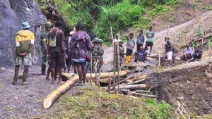 Satgas Pamtas RI-PNG Kewilayahan Papua Pegunungan Yonif 521/DY Pos Eragayam ikut serta membangun jembatan akibat longsor yang mengakibatkan terputusnya jalur perlintasan warga.