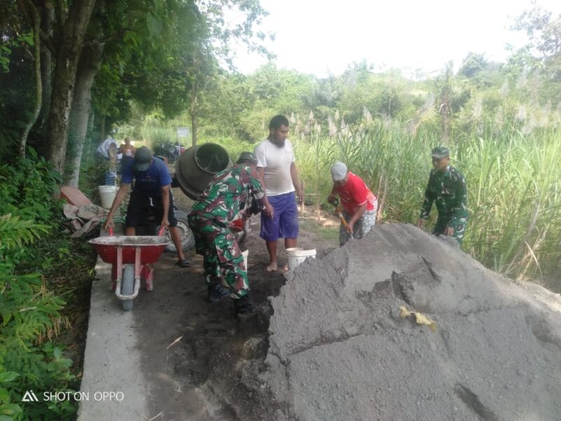 Kegiatan pembangunan talud jalan ini dilakukan secara gotong royong guna memperkuat badan jalan serta mencegah terjadinya longsor, terutama saat musim hujan. Sertu Yono ikut terjun langsung ke lapangan, membantu proses penggalian, pengangkutan material, hingga pemasangan talud bersama masyarakat.