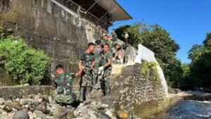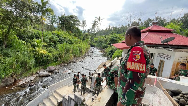 Sungai Geringging, — AgaraNews.com// Babinsa Ramil 08/SGR, Serda Jendri, bersama anggota YTP 896/SP melaksanakan kegiatan pengeluaran batu air yang akan digunakan sebagai bahan pembuatan bronjong Jembatan Baely.
