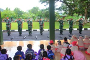 Interaksi hangat terjalin antara para prajurit dan peserta didik. Anak-anak tampak menyimak dengan penuh perhatian saat dijelaskan tentang nilai-nilai kebangsaan, cinta tanah air, serta peran TNI dalam menjaga kedaulatan Negara Kesatuan Republik Indonesia.