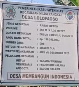 Nias.Agaranews.com // Kepala Desa (Kades) Lölöfaösö, Kecamatan Hiliserangkai, Kabupaten Nias, diduga menyampaikan informasi yang tidak sesuai fakta kepada publik terkait pelaksanaan kegiatan fisik yang bersumber dari Anggaran Dana Desa (ADD) Tahun Anggaran 2025.