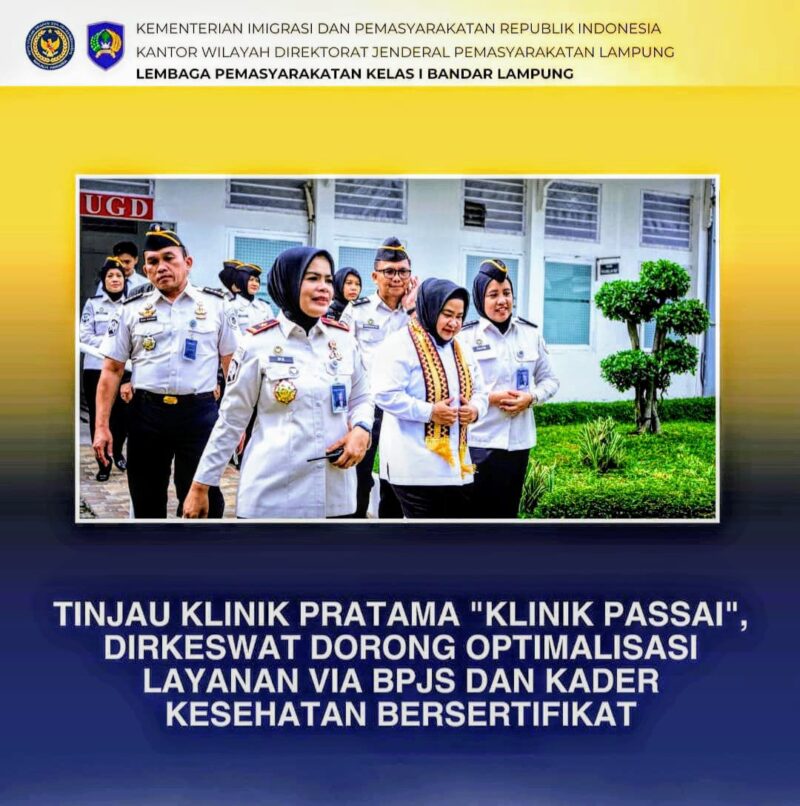 Bandar Lampung, AgaraNews.com // Usai prosesi penyambutan, agenda kunjungan kerja Direktur Perawatan Kesehatan dan Rehabilitasi (Dirkeswat), Adhayani Lubis, berlanjut dengan peninjauan fasilitas kesehatan di Lembaga Pemasyarakatan (Lapas) Kelas I Bandar Lampung. Didampingi Kakanwil Ditjenpas Lampung, Jalu Yuswa Panjang dan Kalapas Ike Rahmawati, Dirkeswat menyambangi langsung Klinik Passai pada Kamis (15/1/2026).