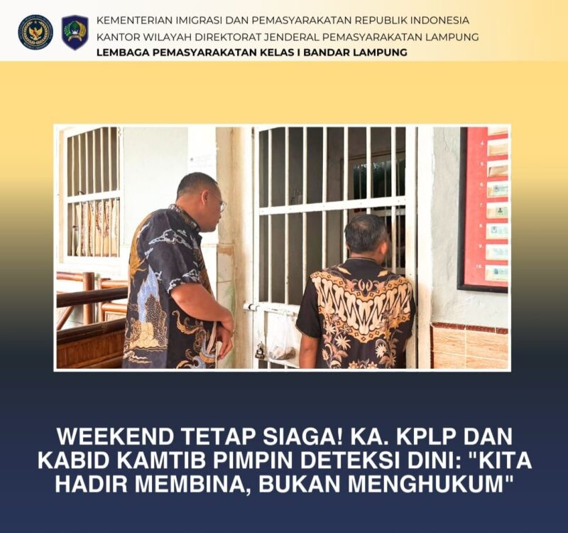 Bandar Lampung, AgaraNews.com // Hari Sabtu bukan alasan untuk melonggarkan pengawasan. Konsistensi menjaga keamanan dan ketertiban (Kamtib) terus ditunjukkan oleh jajaran Lembaga Pemasyarakatan (Lapas) Kelas I Bandar Lampung. Pada Sabtu (17/01), kegiatan deteksi dini tetap berjalan intensif di area blok hunian.