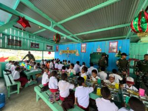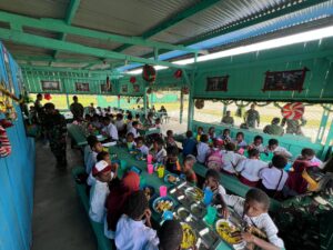 Dalam kegiatan tersebut, para siswa menerima menu makan siang berupa nasi kuning, sayur, dan ayam. Prajurit Pos Kotis juga menyapa anak-anak, memberi motivasi agar rajin belajar dan disiplin, serta mengajak mereka menikmati momen kebersamaan yang sederhana namun bermakna.