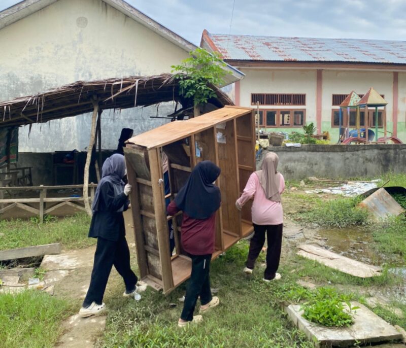 Menanggapi kondisi tersebut, enam mahasiswi KPM Tematik Kebencanaan UIN Ar-Raniry Banda Aceh yang berlatar belakang keilmuan Ilmu Perpustakaan turun langsung melakukan aksi penyelamatan terhadap ruang dan koleksi perpustakaan. Kegiatan yang dilakukan meliputi pembersihan lumpur dan pengeringan koleksi sebagai langkah awal pemulihan fungsi literasi sekolah.