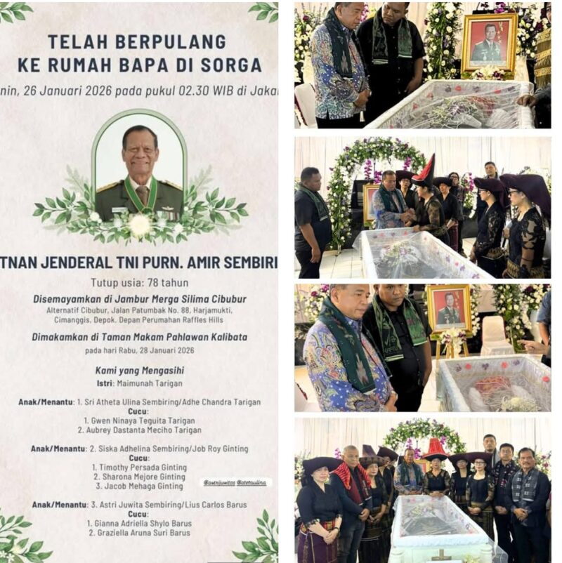 Jakarta, AgaraNews .com // Pemerintah Kabupaten Karo menyampaikan duka cita yang mendalam atas wafatnya Letnan Jenderal TNI (Purn.) Amir Sembiring, yang telah berpulang ke Rumah Bapa di Surga pada Senin, 26 Januari 2026, pukul 02.30 WIB di Jakarta, dalam usia 78 tahun.