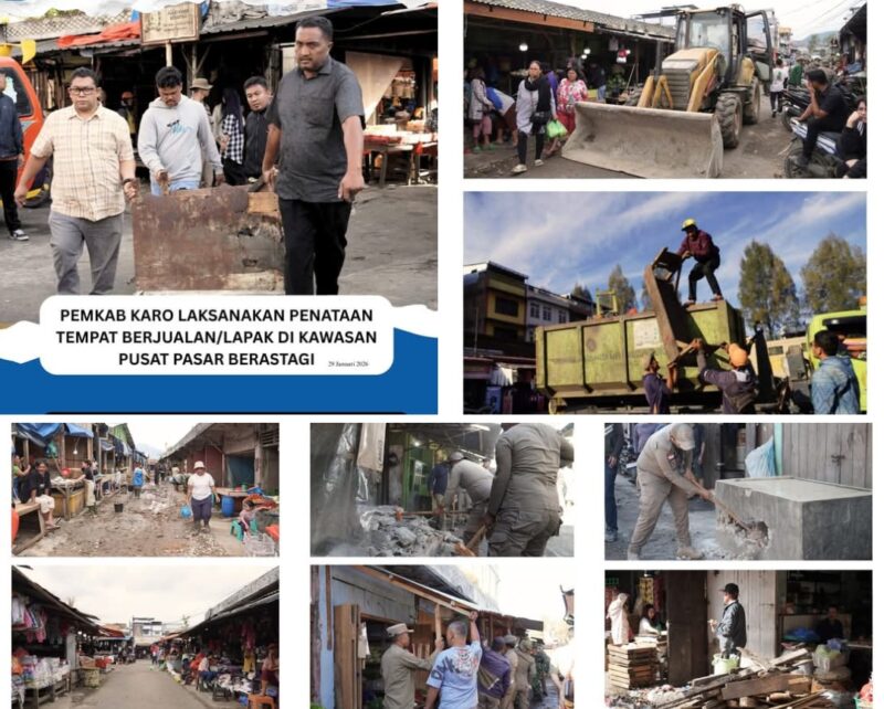 Tanah Karo, AgaraNews.com // Pemerintah Kabupaten Karo terus berupaya meningkatkan kualitas kawasan Pusat Pasar Berastagi menjadi lebih tertib, aman, bersih, dan nyaman bagi pedagang dan pengunjung. Pada Kamis (29/01/2026), Pemkab Karo melaksanakan kegiatan penataan tempat berjualan/lapak bagi pedagang di kawasan tersebut.