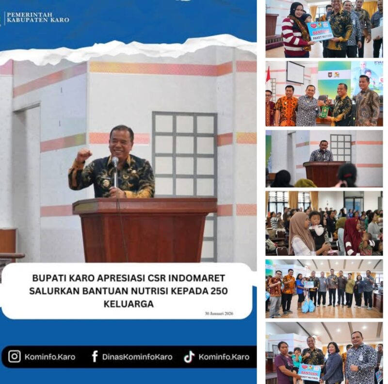 Tanah Karo, AgaraNews.com // Pemerintah Kabupaten Karo mengapresiasi komitmen PT Indomarco Prismatama (Indomaret) dalam menyalurkan bantuan nutrisi kepada masyarakat melalui program Corporate Social Responsibility (CSR). Apresiasi tersebut disampaikan oleh Bupati Karo, Brigjen Pol (Purn) Dr. dr. Antonius Ginting, Sp.OG., M.Kes., di dampingi Sekda Kab Karo, Gelora Kurnia Putra Ginting, S.STP., MM., dan Kepala OPD terkait pada acara Pemberian Bantuan Nutrisi Indomaret & Vidoran yang berlangsung di Aula Rakutta Berahmana Kantor Bupati Karo, Jumat (30/01/2026).