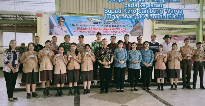 Tanah Karo, AgaraNews com //.Bupati Karo, Brigjen ( Purn ) Dr.dr. Antonius Ginting Sp. OG. M. Kes bersama Ketua PKK Kabupaten Karo, Ny Roswitha Antonius Ginting dan rombongan menyerahkan KTP-EL Pemula kepada perwakilan pelajar SMAN 1 Tigapanah pada kegiatan “Bupati Karo Sambang Warga”, Jumat (30/01/2026).