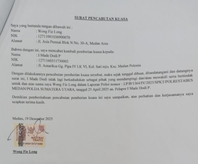 Medan – 09Februari 2026, AgaraNews.com // Wong Felung, pemilik aset scaffolding yang menjadi objek kasus perjanjian sewa antara PT Cahaya Gemilang dan Sahabat Abadi, telah secara resmi mencabut kuasa pengurusan laporan polisi yang sebelumnya diberikan kepada I Made Dodi P.