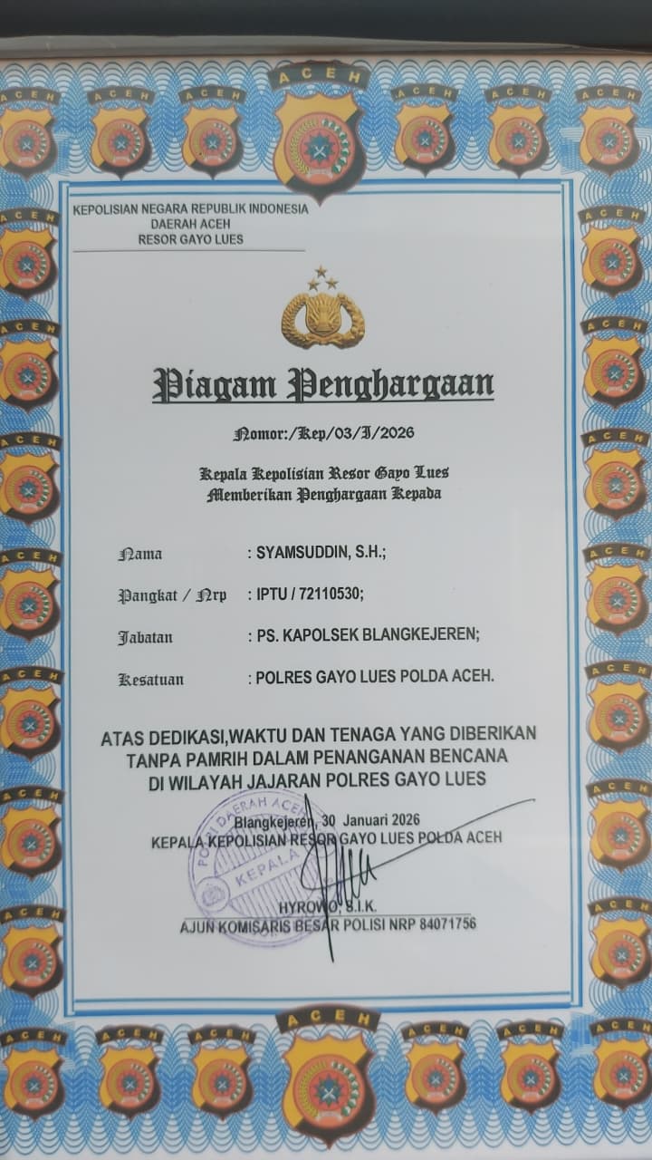 Pemberian penghargaan ini didasarkan pada Keputusan Kapolres Gayo Lues Nomor: Kep/03/I/2026 yang menetapkan nama perwira menengah berpangkat Inspektur Polisi Satu (IPTU) sebagai penerima penghargaan. IPTU tersebut saat ini menjabat sebagai Pelaksana Sementara Kapolsek Blangkejeren dan tercatat di bawah jajaran Polda Aceh. Dalam isi piagam dinyatakan bahwa penghargaan disampaikan sebagai bentuk pengakuan atas dedikasi, waktu, dan tenaga yang dicurahkan tanpa pamrih oleh Kapolsek dan tim dalam penanganan berbagai bencana di wilayah hukum Polres Gayo Lues. Tindakan yang cepat, tepat, dan penuh kepedulian dari jajaran Polsek Blangkejeren dianggap telah menyelamatkan banyak warga serta membantu proses pemulihan pasca-bencana secara efektif.