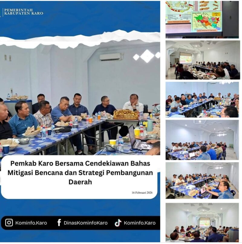 Tanah Karo – 16 Februari 2026, AgaraNews .com // Pemerintah Kabupaten Karo menggelar diskusi bersama Cendekiawan Karo Indonesia dan Tim Percepatan Pembangunan Daerah (TP2D) guna membahas mitigasi bencana longsor, banjir, gempa bumi, serta arah kebijakan pembangunan daerah dalam mendukung visi dan misi kepala daerah.