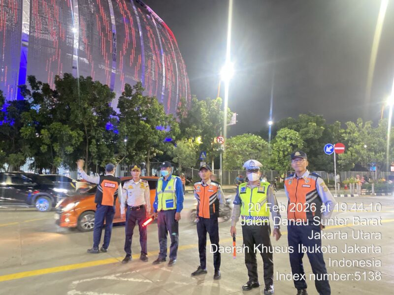 Jakarta Utara, AgaraNews.com // Aparat Satuan Pelaksana (Satpel) Dinas Perhubungan Kecamatan Tanjung Priok melakukan pengamanan dan pengaturan lalu lintas saat pertandingan sepak bola antara Persija Jakarta melawan PSM Makassar yang digelar di Jakarta International Stadium (JIS), Jumat (20/2/2026).