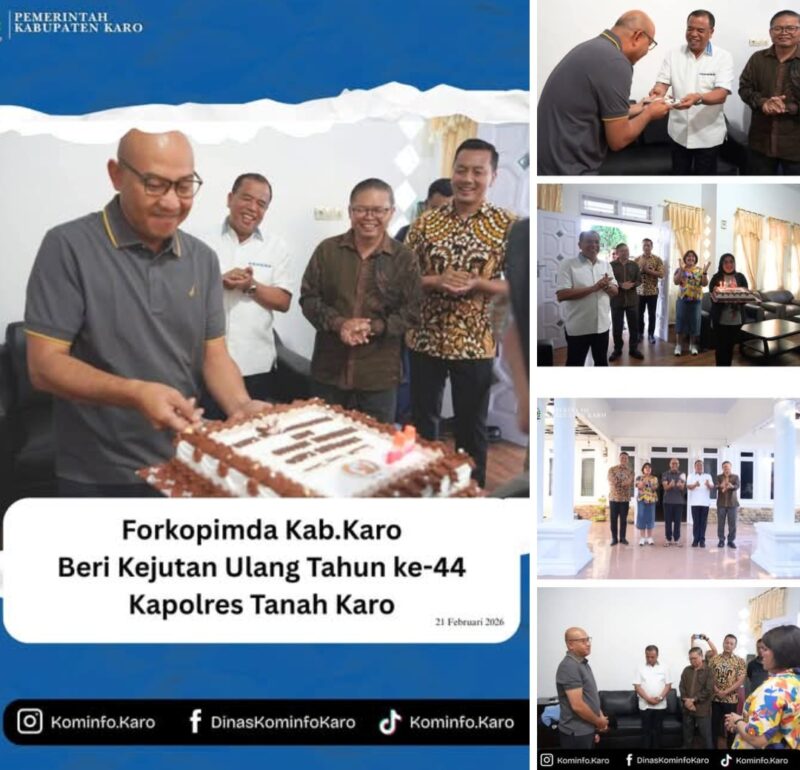Tanah Karo , AgaraNews.com // Bupati Karo, Brigjen Pol (Purn) Dr. dr. Antonius Ginting, Sp.OG., M.Kes., memberikan kejutan ulang tahun ke-44 kepada Kapolres Tanah Karo, AKBP Pebriandi Haloho, S.H., S.I.K., (tautan tidak tersedia), di Rumah Dinas Kapolres pada Sabtu (21/2/2026). Kejutan ini merupakan bentuk perhatian dan kebersamaan Forum Koordinasi Pimpinan Daerah (Forkopimda) Kab. Karo yang diwakili oleh Bupati Karo, Wakil Bupati Karo, Kepala Kejaksaan Negeri Karo, dan Sekretaris Daerah Kabupaten Karo.