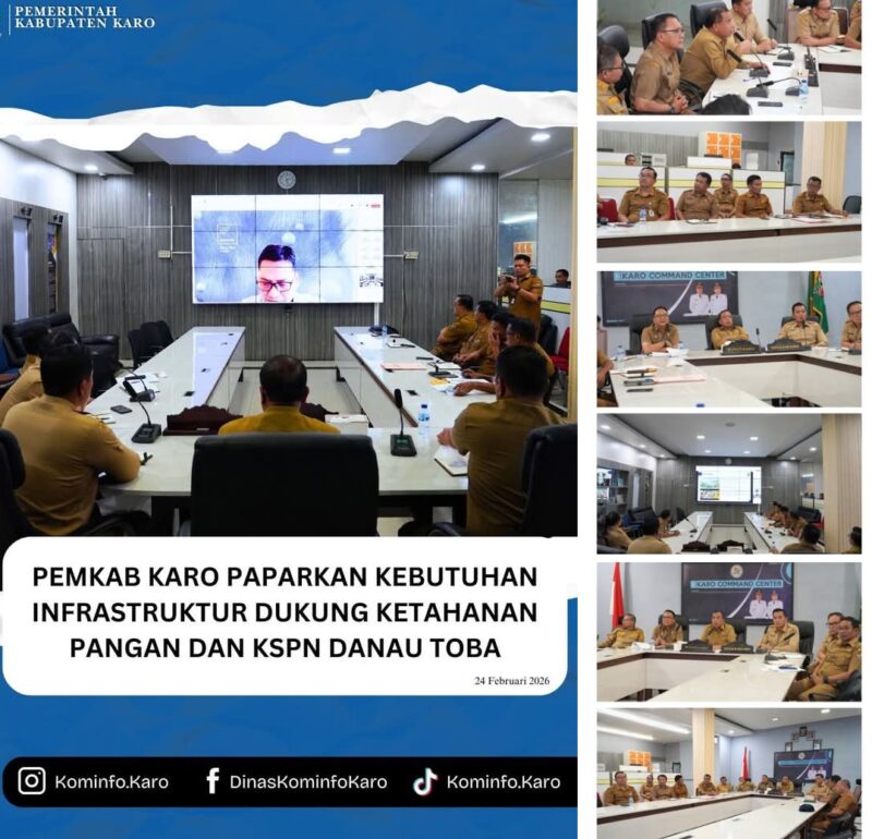 Tanah Karo, AgaraNews.com // Bupati Karo, Brigjen Pol (Purn) Dr. dr. Antonius Ginting, Sp.OG., M.Kes., didampingi Wakil Bupati Karo, Komando Tarigan, SP., Sekretaris Daerah Kabupaten Karo, Gelora Kurnia Putra, S.STP., MM., dan OPD terkait mengikuti Rapat Koordinasi bersama Kementerian Koordinator Bidang Infrastruktur dan Pembangunan Kewilayahan RI secara virtual pada Selasa (24/2). Dalam kesempatan tersebut, Pemerintah Kabupaten Karo memaparkan kebutuhan infrastruktur daerah guna mendukung ketahanan pangan dan pengembangan Kawasan Strategis Pariwisata Nasional (KSPN) Danau Toba.