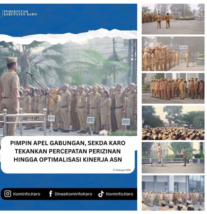 Tanah Karo, AgaraNews.com // Mewakili Bupati Karo, Brigjen Pol (Purn) Dr. dr. Antonius Ginting, Sp.OG., M.Kes, Sekretaris Daerah (Sekda) Kabupaten Karo, Gelora Kurnia Putra Ginting, S.STP, MM, memimpin Apel Gabungan Aparatur Sipil Negara (ASN) di lingkungan Pemerintah Kabupaten Karo, bertempat di Halaman Kantor Bupati Karo, Senin (23/02/2026).