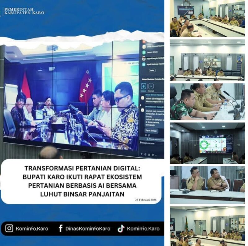 Tanah Karo, AgaraNews.com // Bupati Karo, Brigjen Pol (Purn) Dr. dr. Antonius Ginting, Sp.OG., M.Kes, menghadiri rapat koordinasi tingkat tinggi mengenai pengembangan ekosistem pertanian berbasis Artificial Intelligence (AI) secara virtual pada Senin (23/02/2026).