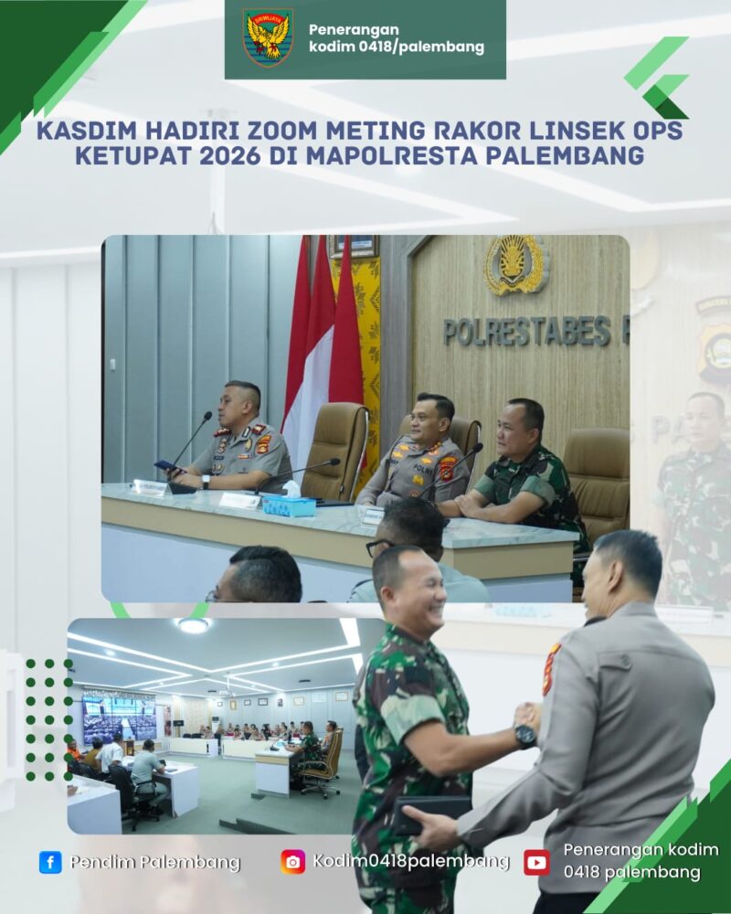Palembang, AgaraNews.com // Dandim 0418/Palembang yang diwakili Kasdim Letkol Inf Dery Septriandi, S.T., M.M., M.Han, menghadiri kegiatan Zoom Meeting Rapat Koordinasi Lintas Sektoral (Rakor Linsek) Operasi Ketupat 2026 yang digelar di Mapolresta Palembang, Senin (2/3/2026).