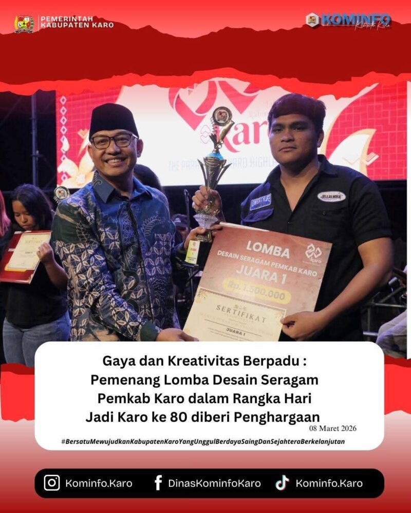 Tanah Karo – 8 Maret 2026, AgaraNews.com // Bupati Karo, Brigjen Pol (Purn) Dr. dr. Antonius Ginting, Sp.OG., M.Kes., melalui Kapolres Tanah Karo AKBP Pebriandi Haloho, S.H., S.I.K., (tautan tidak tersedia) dan Asisten Pemerintahan dan Kesejahteraan Rakyat Dr. Eddi Surianta, M.Pd, menyerahkan hadiah kepada pemenang Lomba Desain Seragam Pemkab Karo dalam rangka perayaan Hari Jadi Karo ke 80 di Lapangan Samura Kabanjahe.