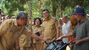 “Alsintan bebas dipakai semua kelompok tani. Tidak ada pungutan. Jangan minta apapun kepada petani,” tegas Bupati kepada seluruh pegawai di Dinas Pertanian termasuk kepala UPT dan penyuluh, pada peresmian Aula Dinas Pertanian sekaligus menerima bantuan satu unit traktor roda dua dan satu unit cultivator dari program CSR Bank Mega Syariah, Senin (16/3/2026).