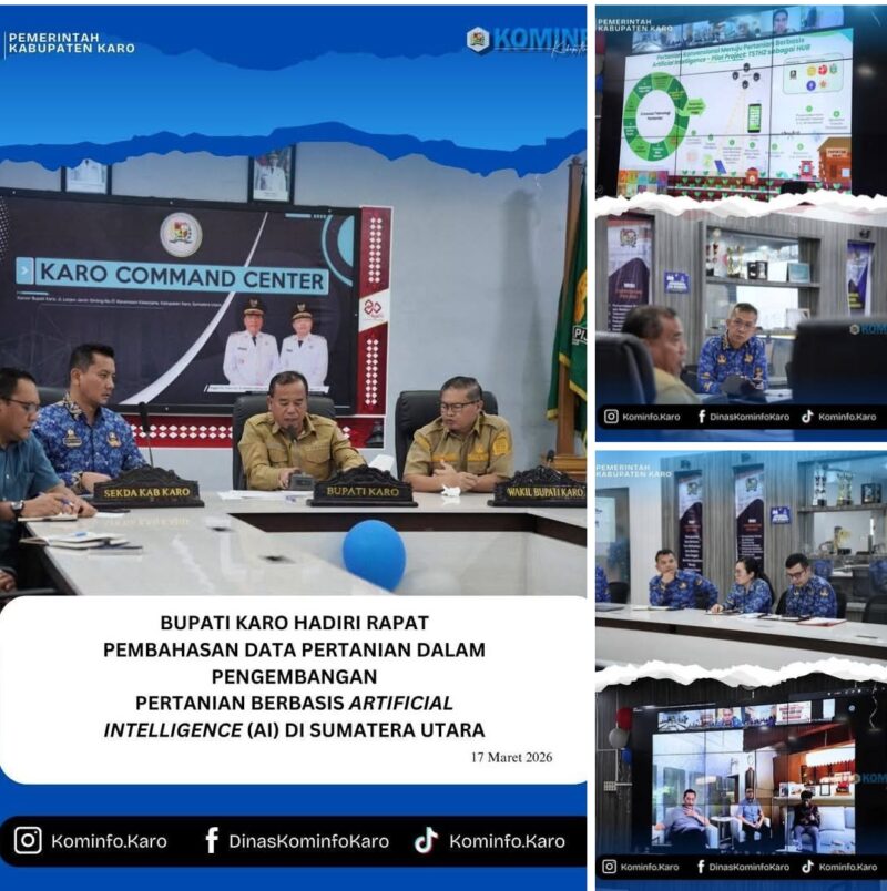 Tanah Karo, AgaraNews.com // Bupati Karo, Brigjen Pol (Purn) Dr. dr. Antonius Ginting, Sp. OG., M.Kes, hadiri rapat pembahasan data pertanian untuk pengembangan pertanian berbasis Artificial Intelligence (AI) di Sumatera Utara. Rapat ini bertujuan mengidentifikasi kebutuhan data pertanian dan membahas strategi pengumpulan, pengolahan, dan analisis data.
