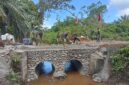 Proses pembangunan dilakukan secara bertahap oleh personel di lapangan, mulai dari perakitan pipa baja, pembuatan dudukan jembatan, pembangunan pondasi beton, pemasangan struktur Aramco, penimbunan dan pemadatan tanah serta pasir pada bagian oprit, hingga pengecatan akhir sebagai tahap finishing.