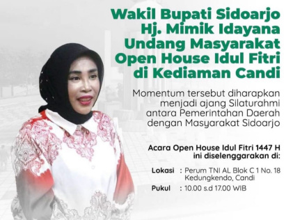 Sidoarjo, AgaraNews.com // Dalam rangka merayakan Hari Raya Idul Fitri 1447 Hijriah, Wakil Bupati Sidoarjo, Hj. Mimik Idayana, akan menggelar open house selama tiga hari berturut-turut.
