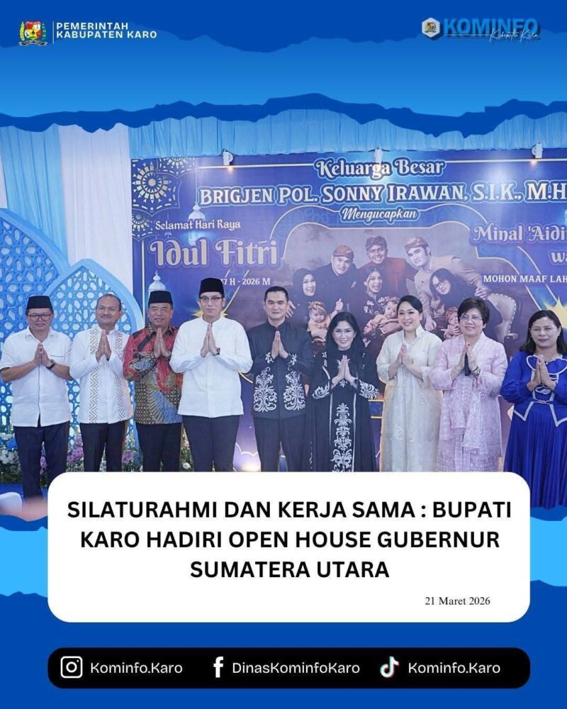 Medan, AgaraNews.com // Bupati Karo, Brigjen Pol (Purn) Dr. dr. Antonius Ginting, Sp. OG., M.Kes, dan Wakil Bupati Karo, Komando Tarigan, SP, menghadiri Acara Open House Gubernur Sumatera Utara di Aula TRN Rumah Dinas Gubernur Sumatera Utara, Sabtu (21/3/2026). Kegiatan ini merupakan salah satu upaya untuk memperkuat silaturahmi dan kerja sama antara Pemerintah Provinsi Sumatera Utara dan Kepala Daerah se-Provinsi Sumatera Utara.