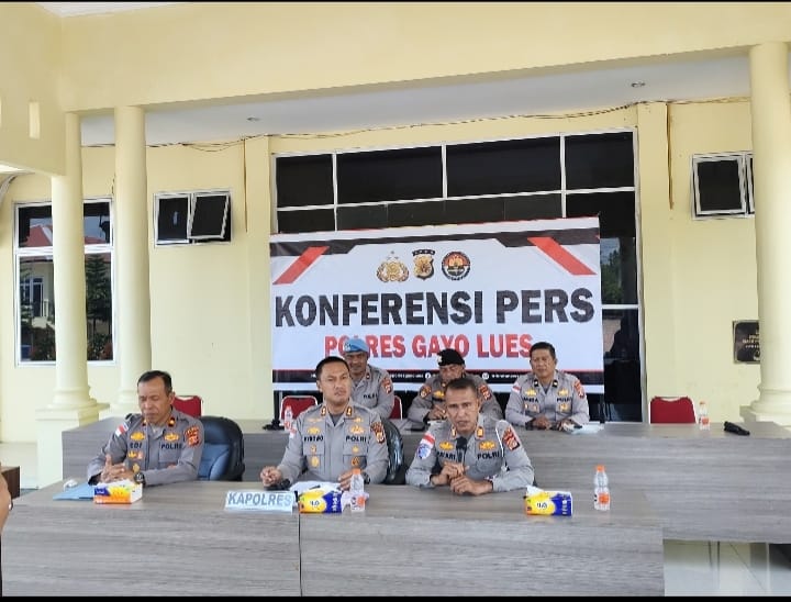 Konferensi pers tersebut dipimpin langsung oleh Kapolres Gayo Lues AKBP Hyrowo, S.I.K., didampingi Wakapolres Kompol Edi Yaksa, S.Sos., serta Kasatlantas AKP As’ari, S.H.