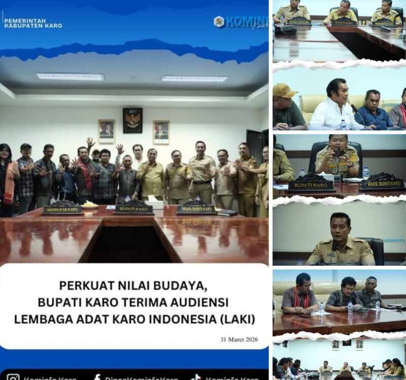Tanah Karo, AgaraNews.com // Bupati Karo, Brigjen Pol (Purn) Dr. dr. Antonius Ginting, Sp.OG., M.Kes, menerima audiensi pengurus Lembaga Adat Karo Indonesia (LAKI) di Ruang Rapat Bupati Matang Sitepu, Kantor Bupati Karo, Selasa (31/03/2026).