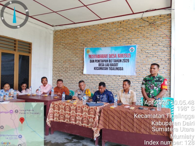 Dairi,AgaraNews.com//Babinsa Koramil 04/Tigalingga, Kodim 0206/Dairi, Serma Imanuel Ginting menghadiri dan mengikuti Musyawarah Desa (Musdes) dalam rangka penetapan penerima Bantuan Langsung Tunai (BLT) serta program ketahanan pangan Tahun Anggaran 2026 di Balai Desa Lau Bagot, Kecamatan Tigalingga, Kabupaten Dairi, Kamis (9/4/2026). Kehadiran Babinsa menjadi bagian dari upaya TNI dalam mengawal jalannya program pemerintah agar tepat sasaran dan berjalan transparan.