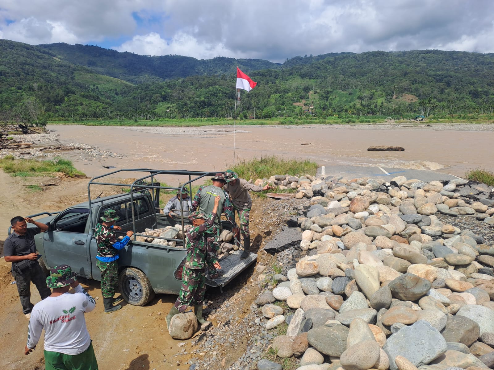 Kutacane Agaranews.com – Babinsa jajaran Kodim 0108/Agara mengangkut material batu sungai untuk bahan pembuatan pengecoran pondasi jembatan gantung perintis di desa Kumbang Jaya Kecamatan Badar Kabupaten Aceh Tenggara Jumat (10/04/2026).