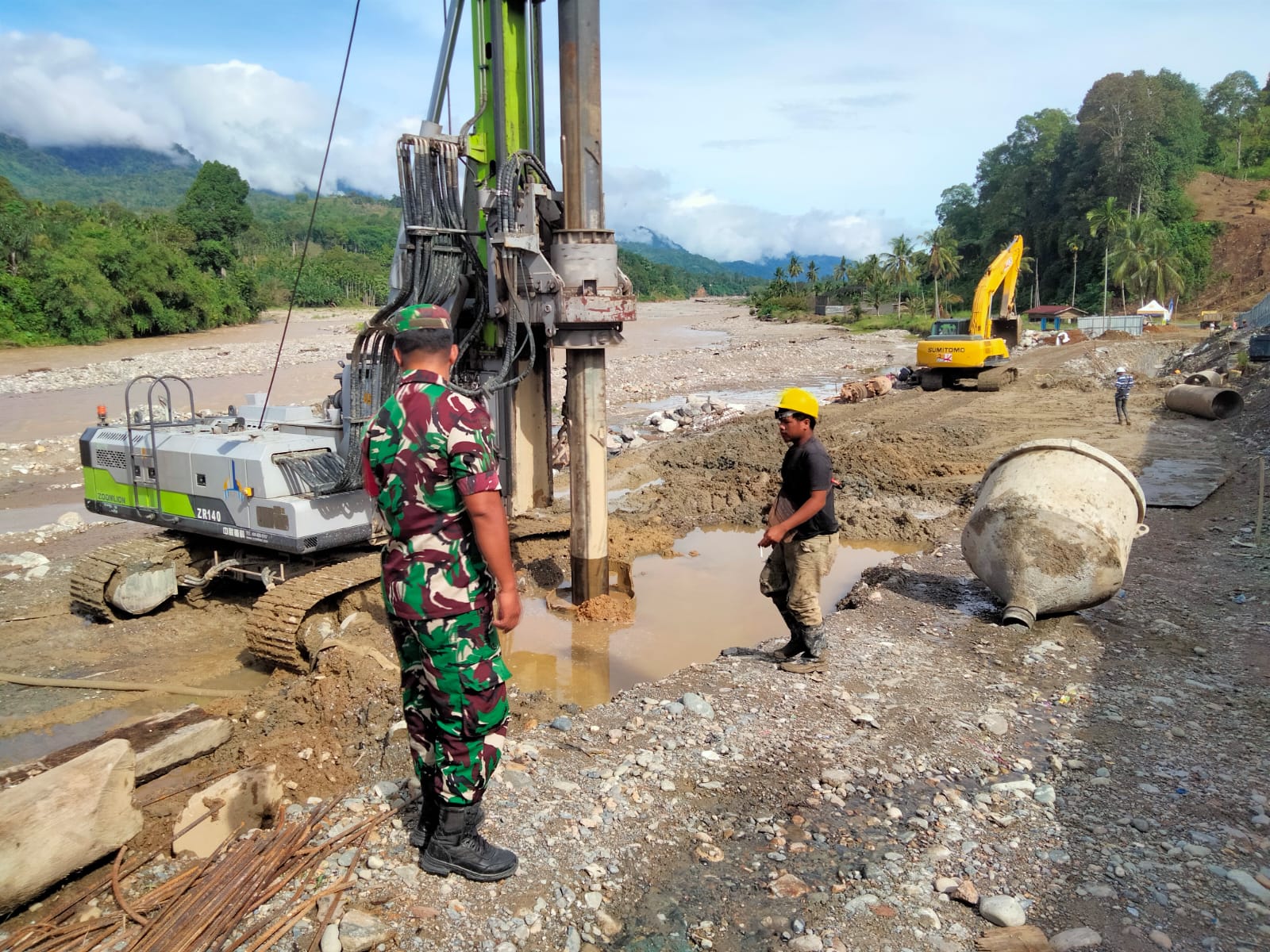 Serka Suprayogi menyampaikan Dalam kegiatannya, Babinsa memantau langsung pekerjaan yang saat ini pada tahap pemasangan paku bumi untuk penguatan jembatan nantinya, berharap progres kegiatan ini dapat berjalan lancar dan akan lebih cepat rampung