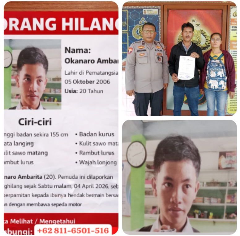 Simalungun, AgaraNews.com / / Polsek Gunung Malela Polres Simalungun Polda Sumatera Utara menyebarkan informasi orang hilang kepada seluruh lapisan masyarakat dan memohon bantuan aktif dari publik untuk menemukan seorang pemuda bernama Okanaro Ambarita (20). Pemuda ini dilaporkan menghilang sejak Sabtu malam, 04 April 2026, setelah berpamitan kepada ibunya hendak bermain bersama teman dengan membawa sepeda motor. Hingga laporan resmi diterima Polsek Gunung Malela pada Sabtu, 11 April 2026, pukul 10.00 WIB, sudah lebih dari sepekan Okanaro tidak pulang ke rumah dan nomor handphone-nya tidak dapat dihubungi sama sekali.