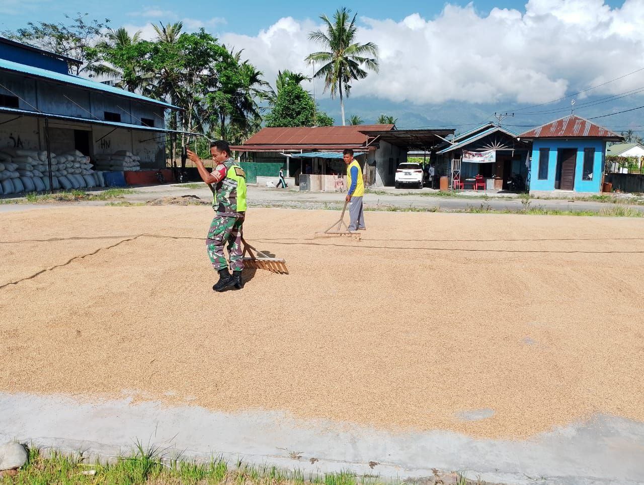 Babinsa Posramil Tanoh Alas Bantu Warga Jemur Padi Pasca Panen