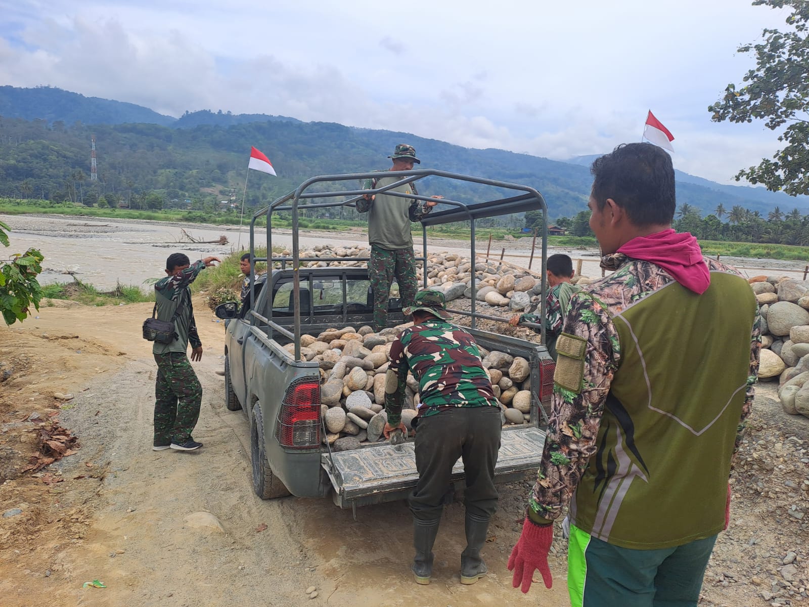Babinsa Angkut Batu Sungai Material Cor Pondasi Jembatan Gantung