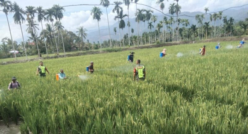 Laksanakan Pendampingan Kepada Petani Babinsa Bantu Semprot Hama Tanaman Padi
