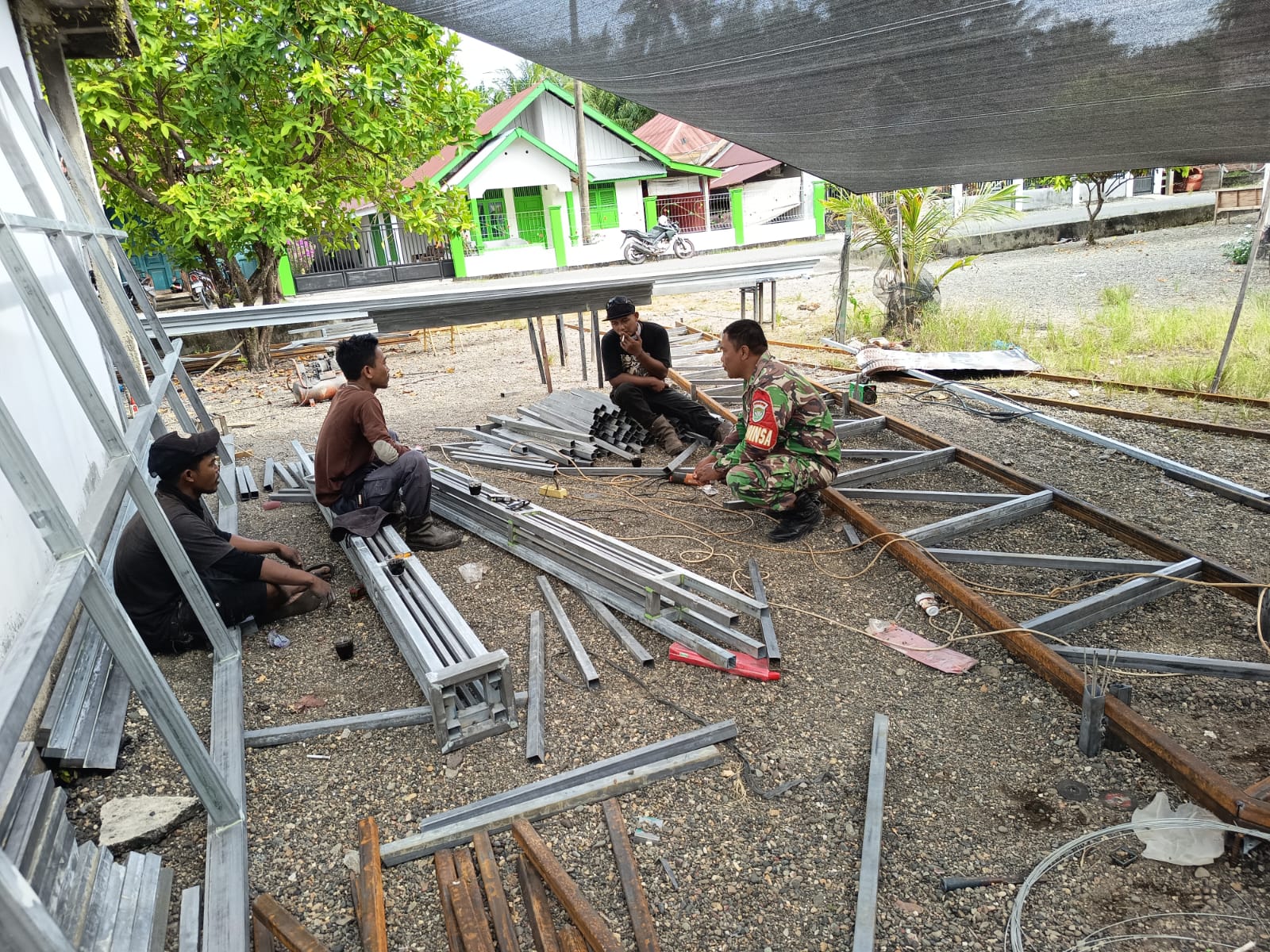 Nagan Raya. Agaranews.com Sersan satu Sudarmadi Babinsa posramil kuala pesisir melaksanakan komunikasi sosial dengan pekerja pembuatan rangka baja atas koperasi desa dan kelurahan merah putih ( kdkmp ) di desa kuala trang kec. Kuala pesisir kab. Nagan raya. Rabu ( 15/04/2026 )