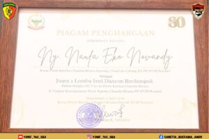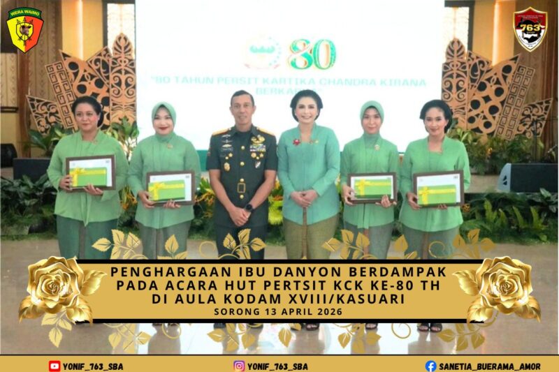 Manokwari, 15 April 2026, AgaraNews.com // Suasana penuh khidmat dan kebanggaan menyelimuti Aula Kodam XVIII/Kasuari dalam rangka peringatan Hari Ulang Tahun Persit Kartika Chandra Kirana ke-80 tahun. Kegiatan tersebut menjadi momen istimewa dengan adanya pemberian penghargaan kepada Ibu Danyon yang dinilai telah memberikan kontribusi nyata dan berdampak positif dalam mendukung kegiatan organisasi Persit serta satuan. (13/4).Dalam rangkaian acara yang berlangsung meriah, penghargaan kepada Ibu Danyon diberikan sebagai bentuk apresiasi atas dedikasi, loyalitas, serta peran aktif dalam mendukung program-program Persit yang berorientasi pada kesejahteraan keluarga prajurit dan masyarakat. Salah satu sosok yang mendapat perhatian dalam kegiatan tersebut adalah Ny. Naufa Eko Novandy selaku Ketua Persit Kartika Chandra Kirana Ranting 3 Yonif 763/SBA, yang dinilai berhasil menunjukkan kiprah nyata dalam mendukung berbagai kegiatan Persit di lingkungan satuan.Pemberian penghargaan ini juga menjadi simbol pengakuan atas peran penting seorang istri prajurit dalam mendukung tugas suami di medan pengabdian. Ibu Danyon dinilai mampu menjadi teladan dalam membina keluarga, aktif dalam kegiatan sosial, serta turut memberikan motivasi kepada anggota Persit lainnya untuk terus berkarya dan berkontribusi.Peringatan HUT Persit Kartika Chandra Kirana ke-80 ini diharapkan dapat semakin memperkuat soliditas organisasi serta meningkatkan semangat pengabdian seluruh anggota. Momentum ini sekaligus menjadi pengingat bahwa peran Persit sangat strategis dalam mendukung keberhasilan tugas TNI AD, baik di bidang sosial, pendidikan, maupun kemasyarakatan.(Lia Hambali)