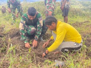 Dalam kegiatan tersebut, prajurit Pos Parim bersama masyarakat saling bahu-membahu menanam bibit kopi di lahan terbuka yang telah disiapkan. Selain memberikan edukasi mengenai cara penanaman, prajurit juga mendampingi masyarakat secara langsung dalam proses penanaman agar bibit dapat tumbuh dengan baik dan memberikan hasil yang bermanfaat di masa mendatang.