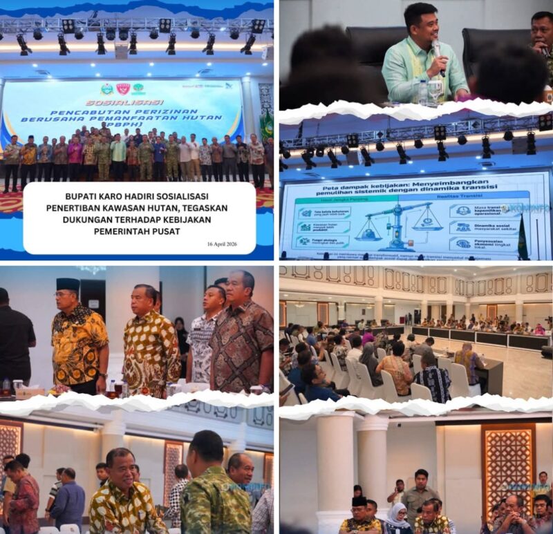 Medan, AgaraNews .com // Bupati Karo, Brigjen Pol (Purn) Dr. dr. Antonius Ginting, Sp.OG., M.Kes., menghadiri kegiatan Sosialisasi Pencabutan Perizinan Berusaha Pemanfaatan Hutan (PBPH) yang diselenggarakan oleh Satuan Tugas Penertiban Kawasan Hutan (Satgas PKH), bertempat di Kantor Gubernur Sumatera Utara, Kamis (16/04/2026).