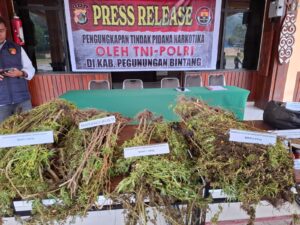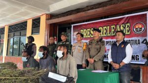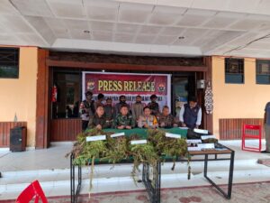 Pegunungan Bintang , AgaraNews.com // Aparat gabungan TNI-Polri melaksanakan kegiatan press release terkait pengungkapan tindak pidana narkotika di Kabupaten Pegunungan Bintang pada hari Rabu, 15 April 2026 di Polres Pegunungan Bintang. Kegiatan tersebut dihadiri langsung oleh Dansatgas Yonif 751/Vira Jaya Sakti (VJS) Letkol Inf Erwan Harliantoro sebagai bentuk dukungan dan komitmen bersama dalam pemberantasan peredaran narkotika di wilayah perbatasan. (Jumat, 17/4/2026).Dalam pengungkapan kasus tersebut, aparat berhasil mengamankan tiga orang tersangka masing-masing berinisial TU, RA, dan MU atas pendalaman dari pemilik Ladang ganja yg tertangkap saat penyisiran Ladang Ganja oleh personel Satgas Yonif 751/VJS. Selain itu, petugas juga berhasil mengamankan sejumlah barang bukti narkotika jenis ganja dalam berbagai bentuk.