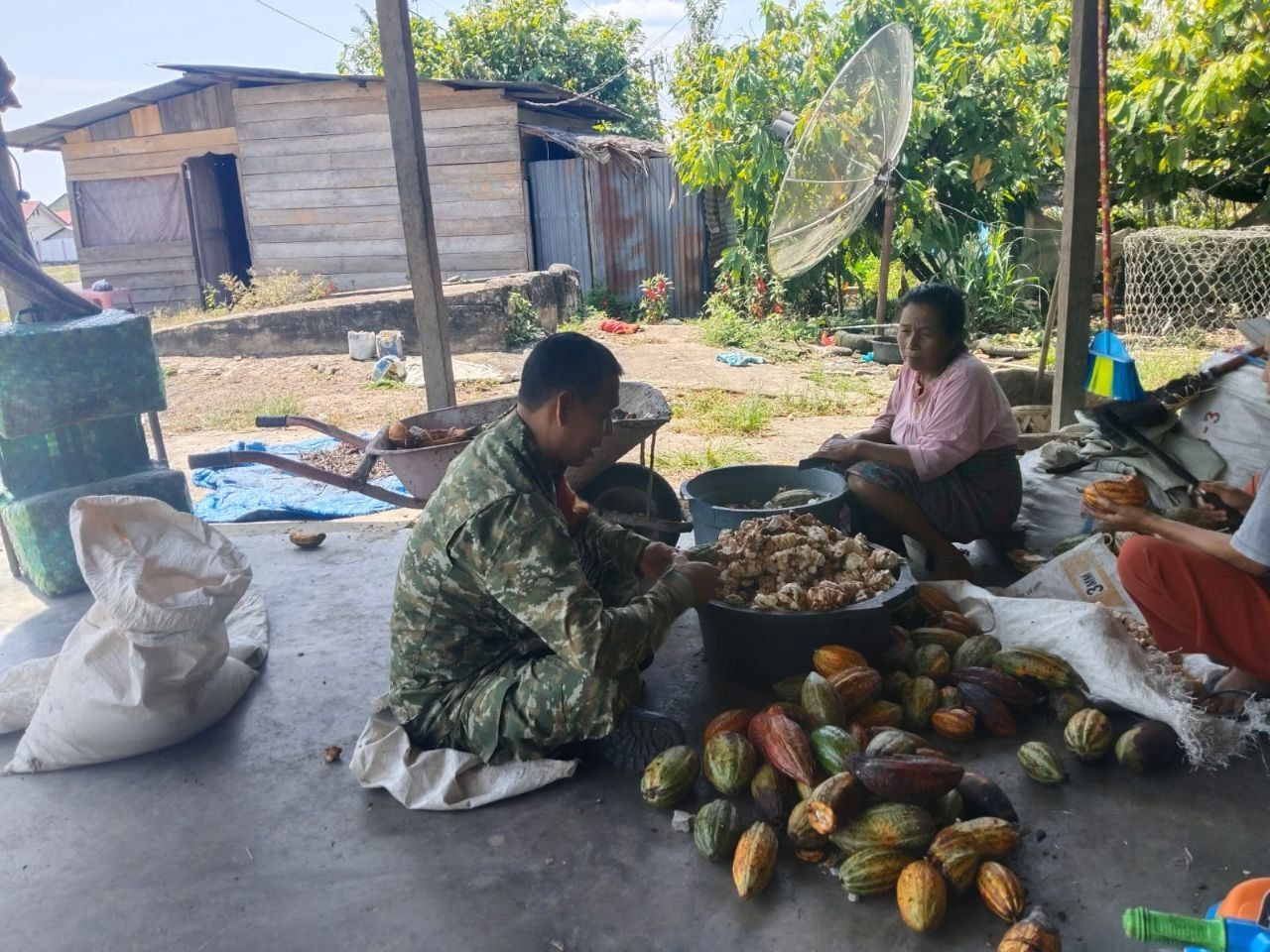 Babinsa Jalin Komsos Ke Desa Bantu Warga Kupas Coklat