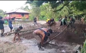 Kebersamaan antara aparat TNI dan warga terlihat kuat dalam setiap tahapan pekerjaan yang dilakukan di lapangan. Mereka bahu-membahu melaksanakan pekerjaan yang kali ini difokuskan pada pengerjaan pengikatan tiang kolong besi ke kaki ayam serta pengangkatan rangka besi angker dalam pembangunan Jembatan Perintis Garuda. Kegiatan tersebut merupakan bagian dari upaya percepatan pembangunan infrastruktur yang sangat dibutuhkan masyarakat setempat.