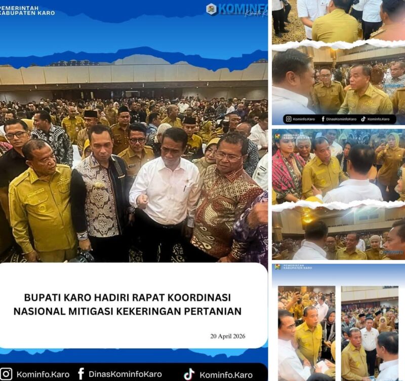 Jakarta, 20 April 2026, AgaraNews .com // Bupati Karo, Brigjen Pol (Purn) Dr. dr. Antonius Ginting, Sp.OG, M.Kes., menghadiri Rapat Koordinasi Nasional (Rakornas) terkait mitigasi kekeringan lahan pertanian yang diselenggarakan oleh Kementerian Pertanian Republik Indonesia di Auditorium Gedung F, Kantor Pusat Kementerian Pertanian, Jakarta Selatan, Senin (20/04/2026).